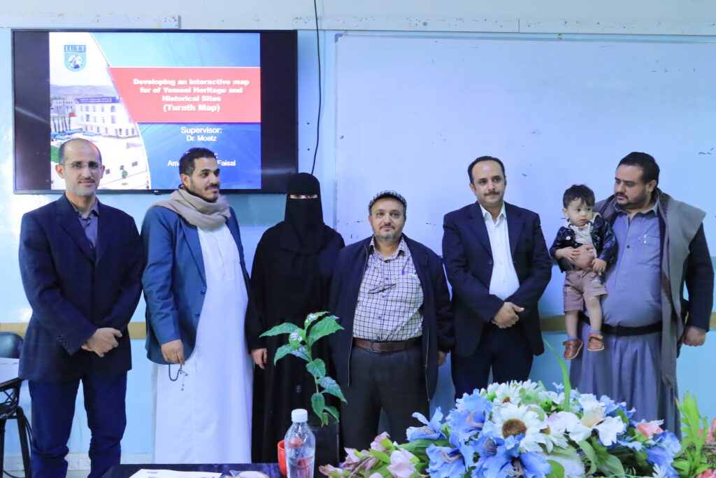 Female students showcased specialized technical projects: Athar (Yemeni traditional fashion via Augmented Reality by Faiza Meshal and Hadeel Al-Qudsi), Thilal Al-Sahab (3D modeling of Hutayb village by Ghadeer Al-Harazi), and Heritage Map (An interactive AR map of prominent Yemeni landmarks by Amat Al-Rahman Al-Fakhri). These projects highlight the faculty’s capability in producing tech-savvy cadres.