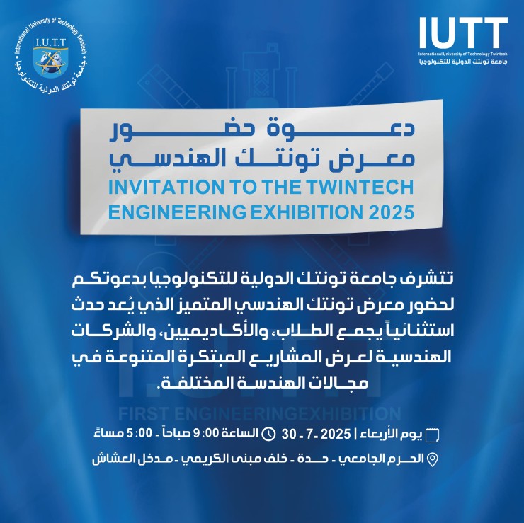 تتشرف جامعة تونتك الدولية للتكنولوجيا بدعوتكم لحضور معرض تونتك الهندسي 2025، والذي يُعد منصة رائدة لعرض الابتكارات والمشاريع المتميزة في مختلف مجالات الهندسة.